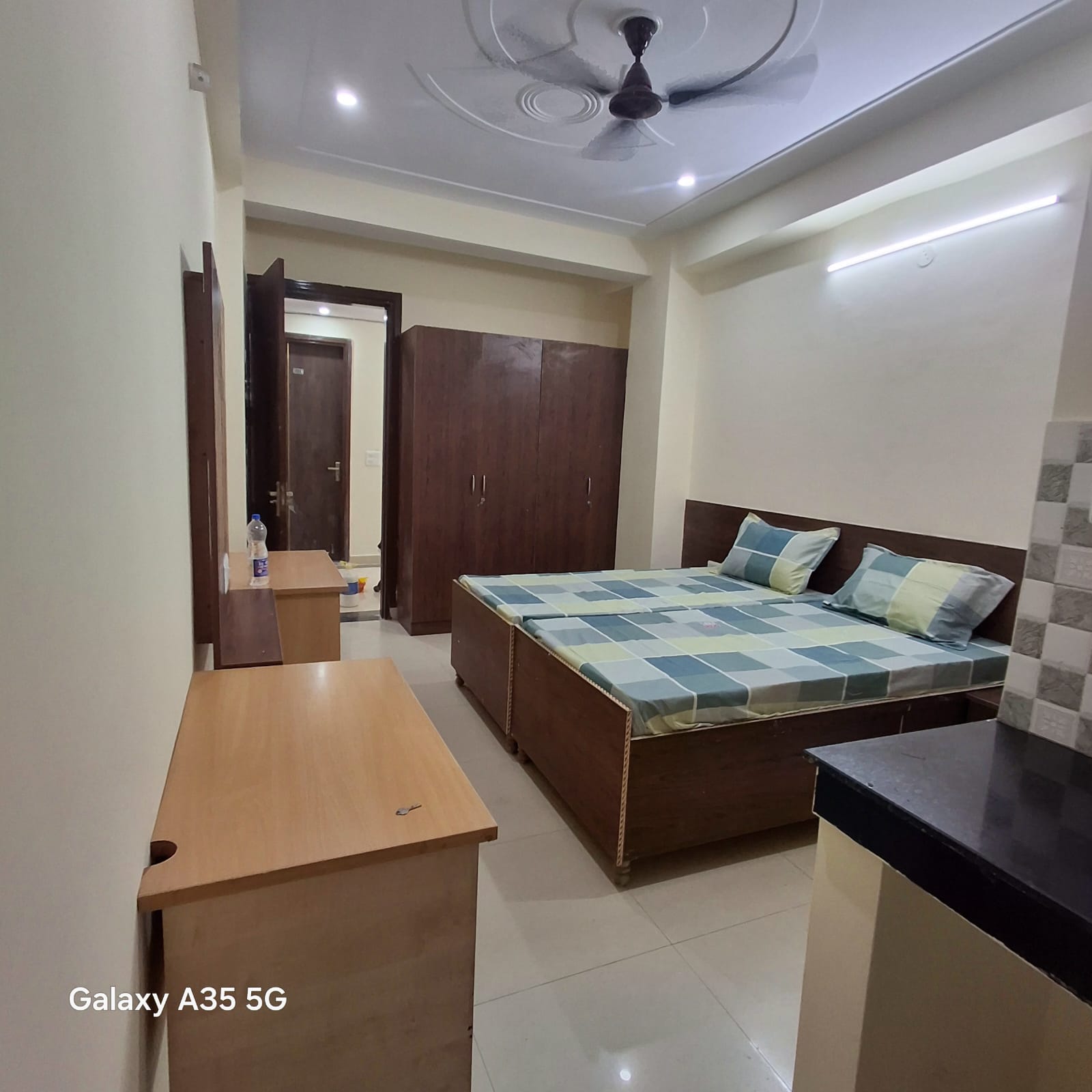 Fully furnished rooms with bed, mattress, cupboard, study table & Smart TV.